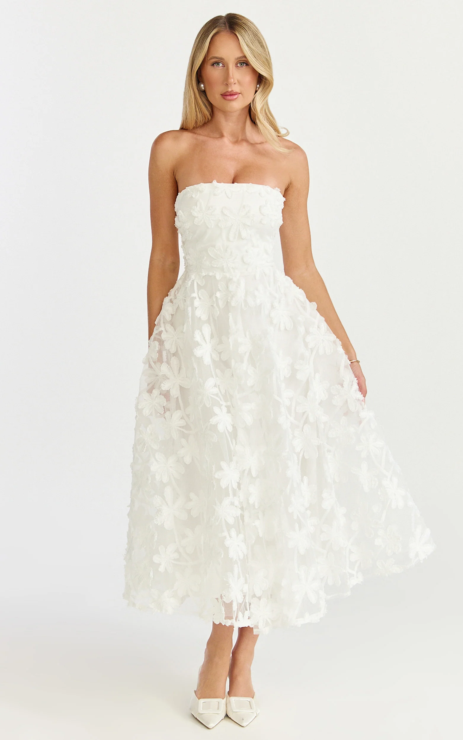Rheiva Midi Dress - Strapless 3D Embroidery Midi Dress in White